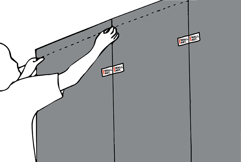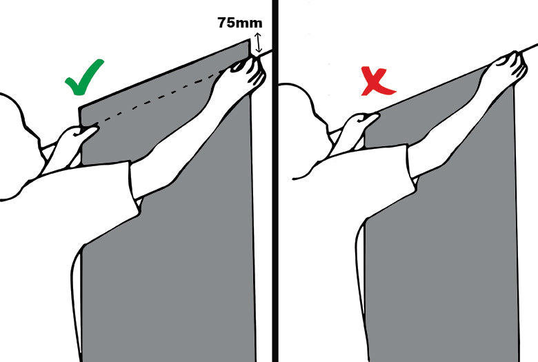 For Peel & Stick wallpaper: Peel the backing paper off the top, around 300mm. Position to the top of the wall and align to your straight edge, (allowing the 100mm excess at the top for trimming back).