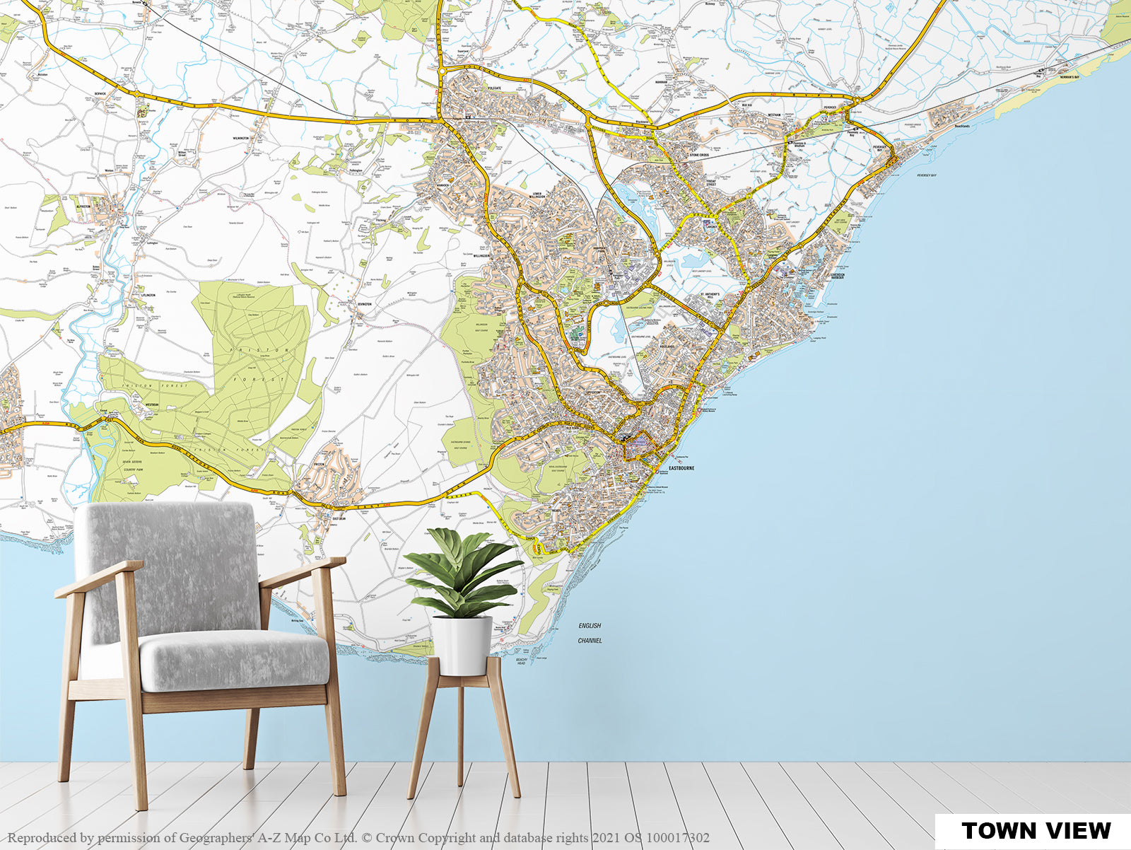 The iconic A-Z map! This Eastbourne map is a fantastic backdrop for any commercial office, meeting room, home office, study room or any room for that matter! The districts of Eastbourne and the surrounding areas are clearly detailed.