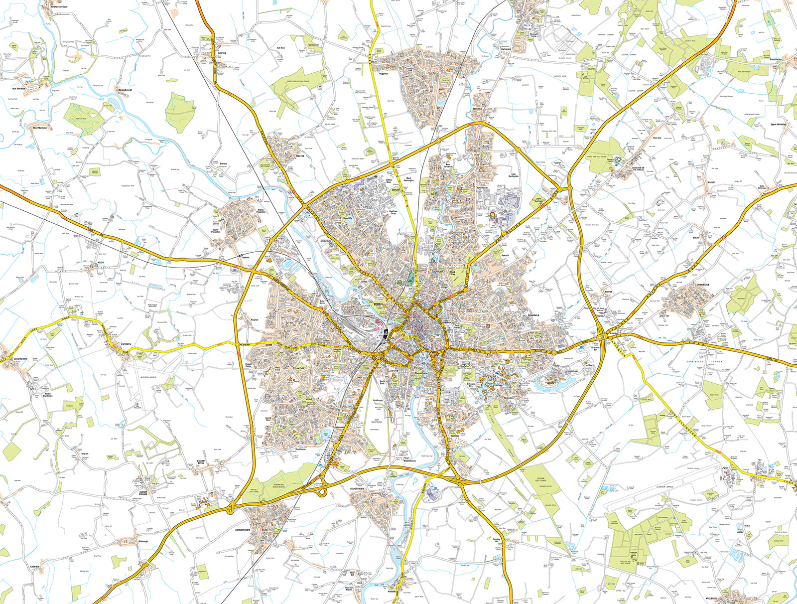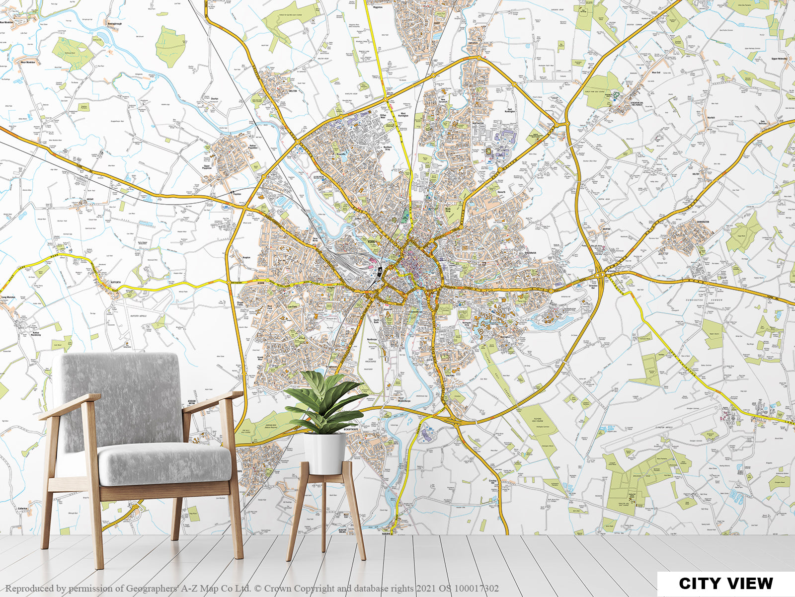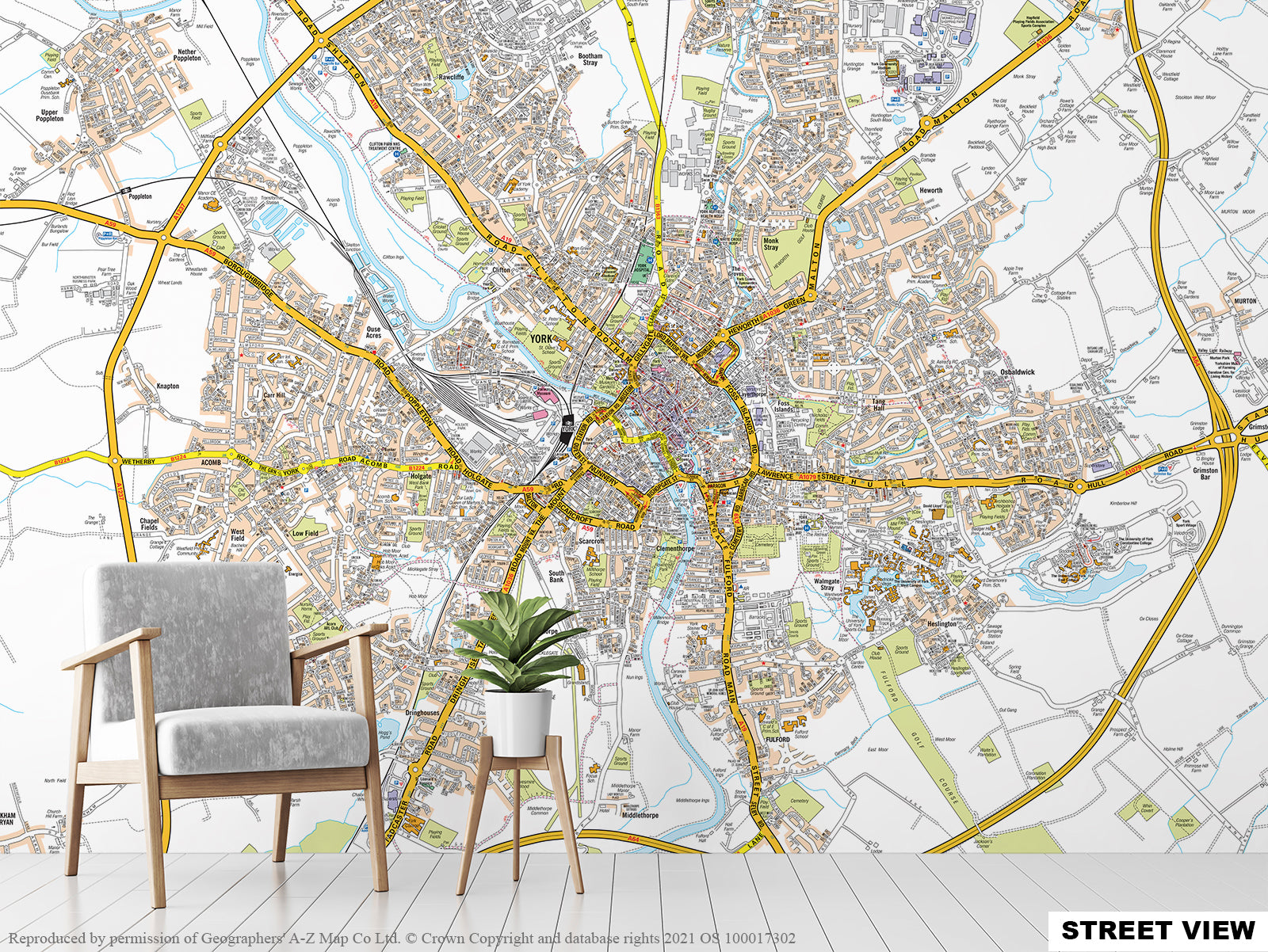 The iconic A-Z map! This York map is a fantastic backdrop for any commercial office, meeting room, home office, study room or any room for that matter! The districts of York and the surrounding areas are clearly detailed.