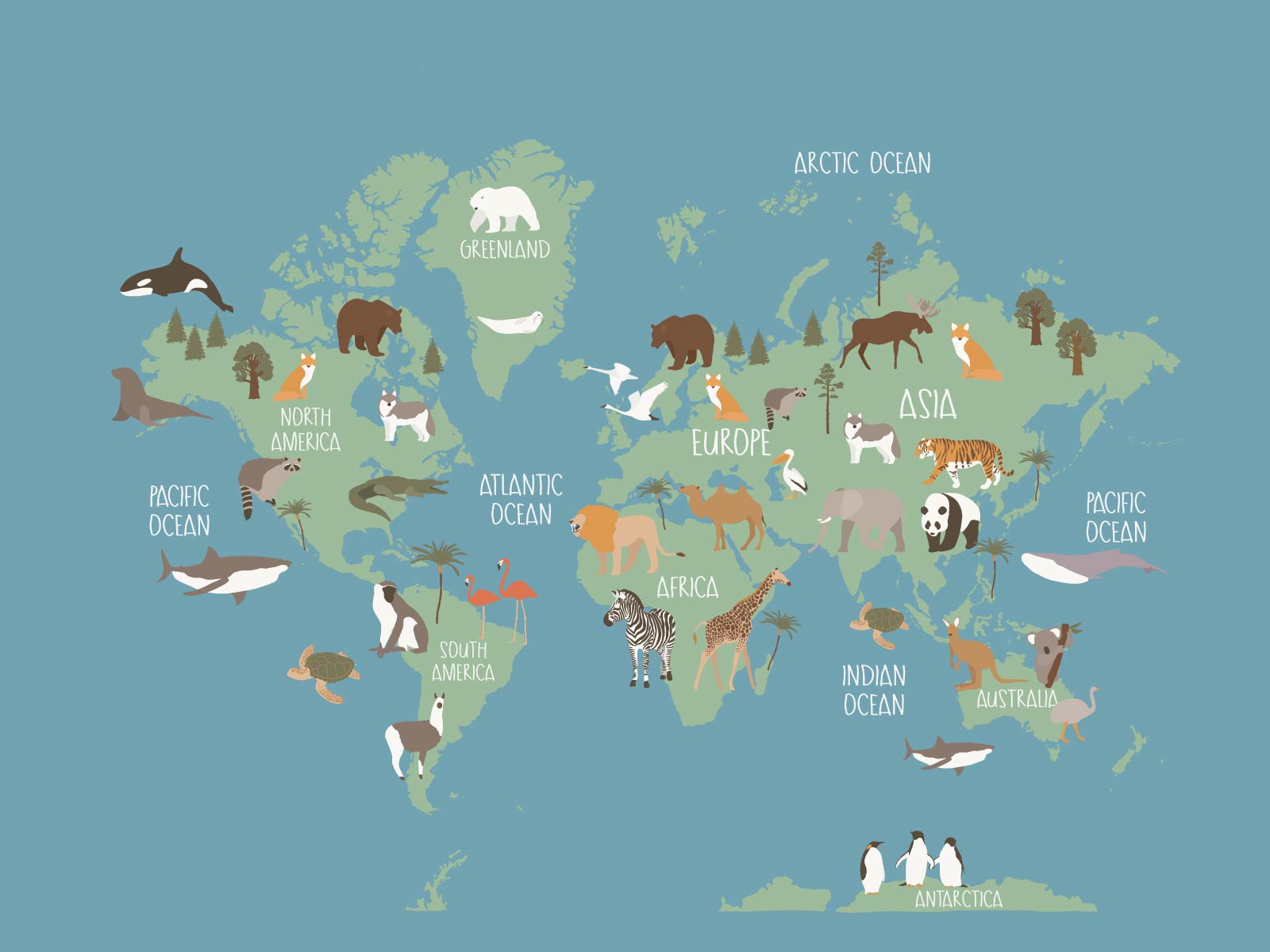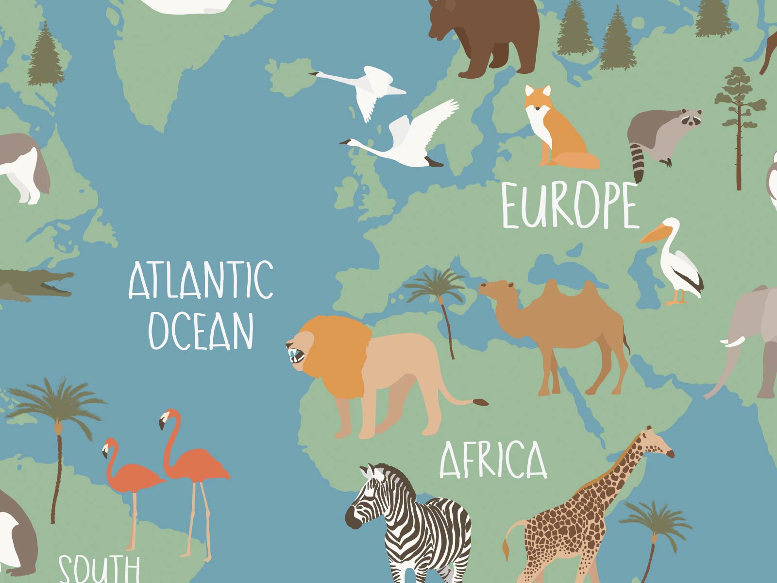 Around the world in 40 animals! A playful world map showing animals from every continent. We love the panda! A map to delight and inspire children. Perfect for creating a feature wall for a child's bedroom or playroom.