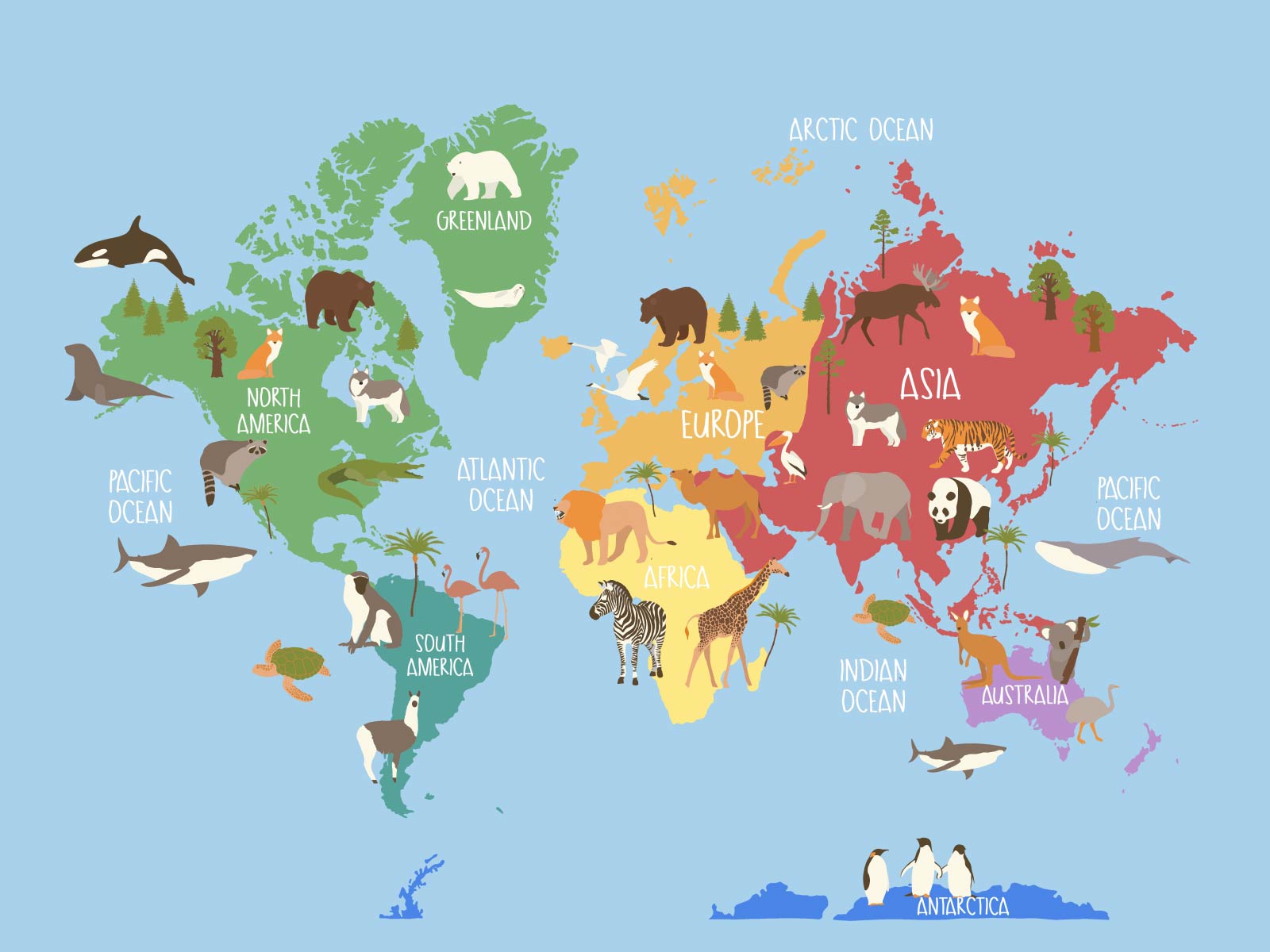 Around the world in 40 animals! A playful world map showing animals from every continent. We love the panda! A map to delight and inspire children. Perfect for creating a feature wall for a child's bedroom or playroom.