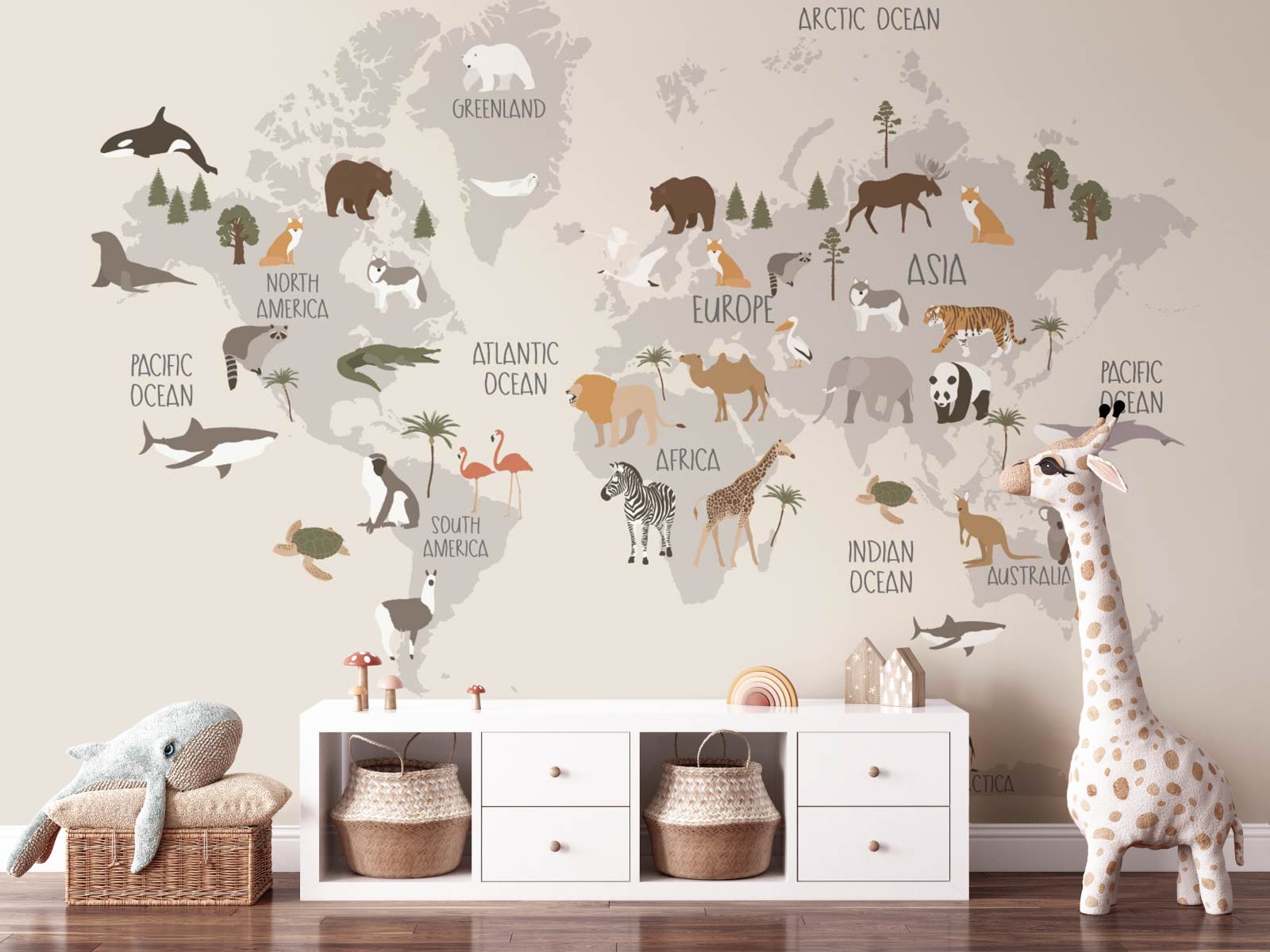 Around the world in 40 animals! A playful world map showing animals from every continent. We love the panda! A map to delight and inspire children. Perfect for creating a feature wall for a child's bedroom or playroom.