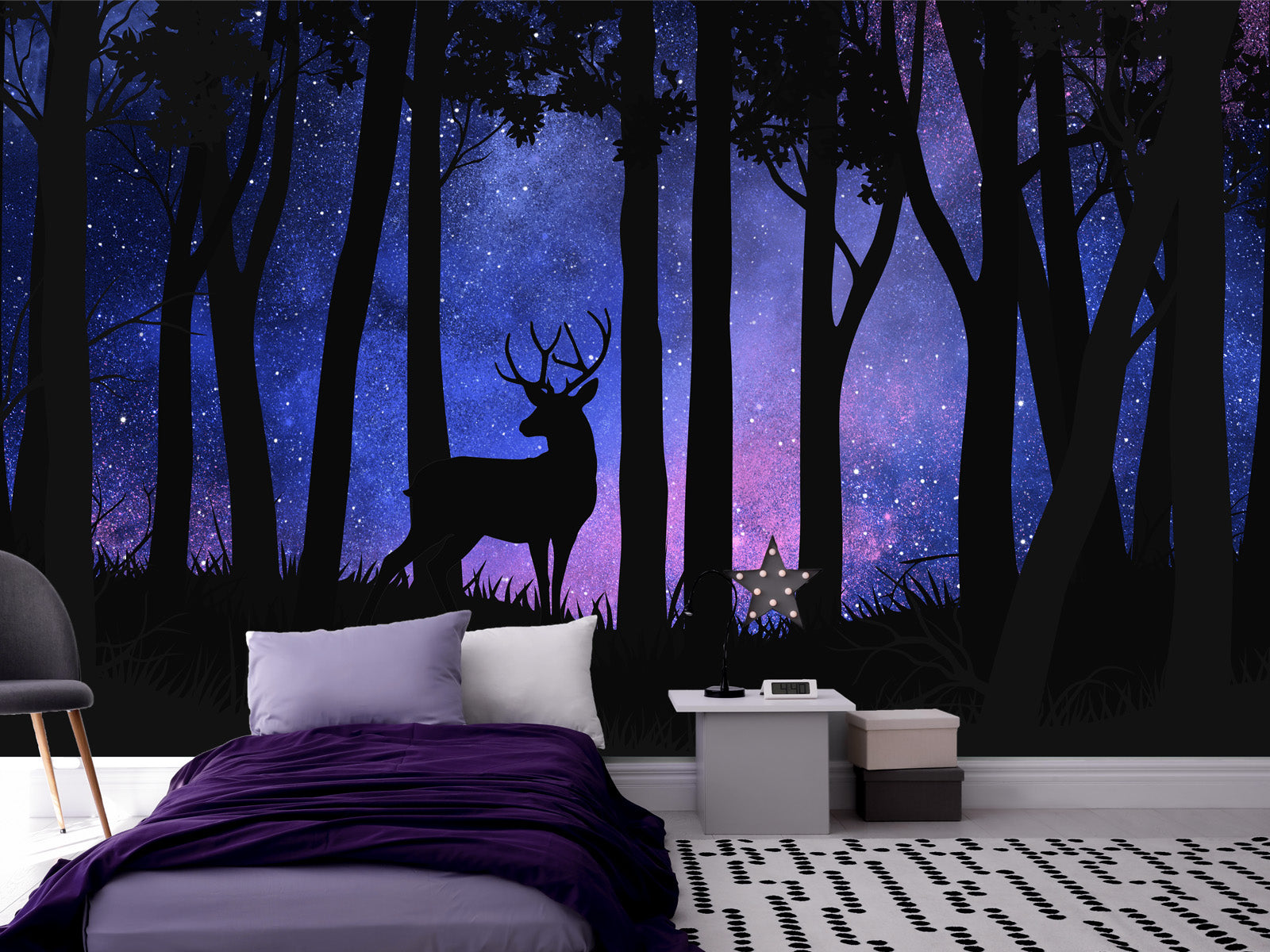 This mural depicts a tranquil nocturnal forest scene, bathed in the soft light of the stars. It would be a perfect choice for any room in need of a touch of magic and wonder. The blue tones of the image are ethereal and dreamlike, creating a sense of mystery and otherworldly beauty.