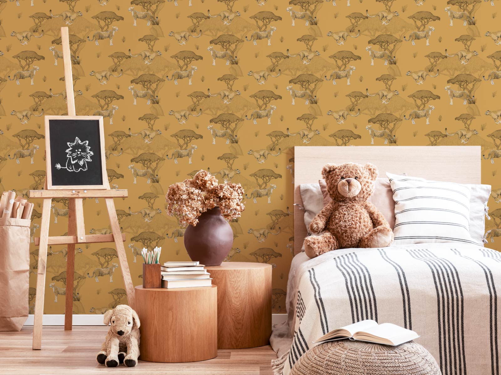 Beautifully illustrated cheetah and acacia trees wallpaper. Bring the beautiful savanna landscape into your home. Suitable for children's room and playroom.