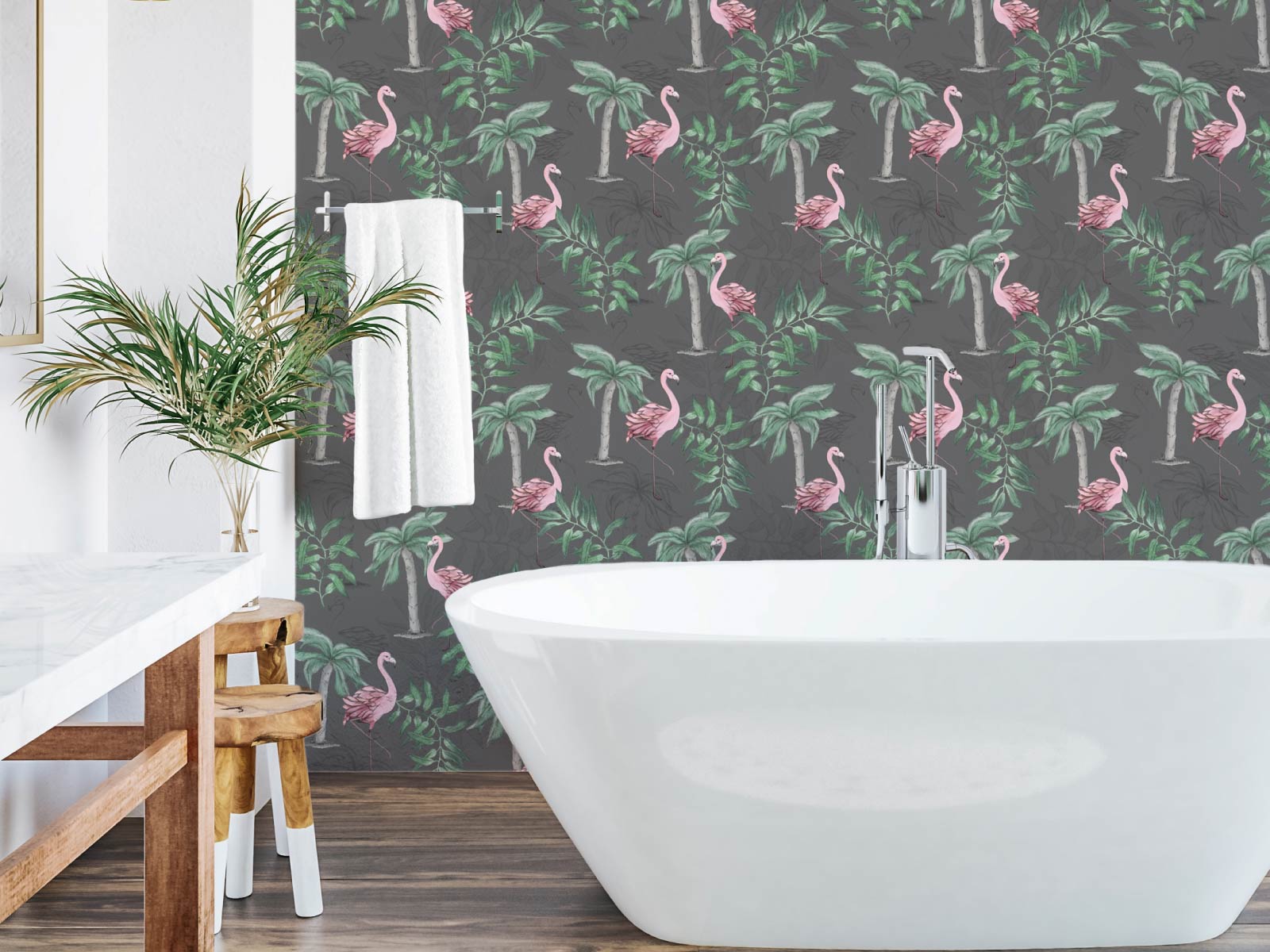 Capture the feeling of the tropics with this stunning fancy flamingo wallpaper, featuring palm trees and palm leaves. Create an eye catching feature wall or a sensational full room coverage.