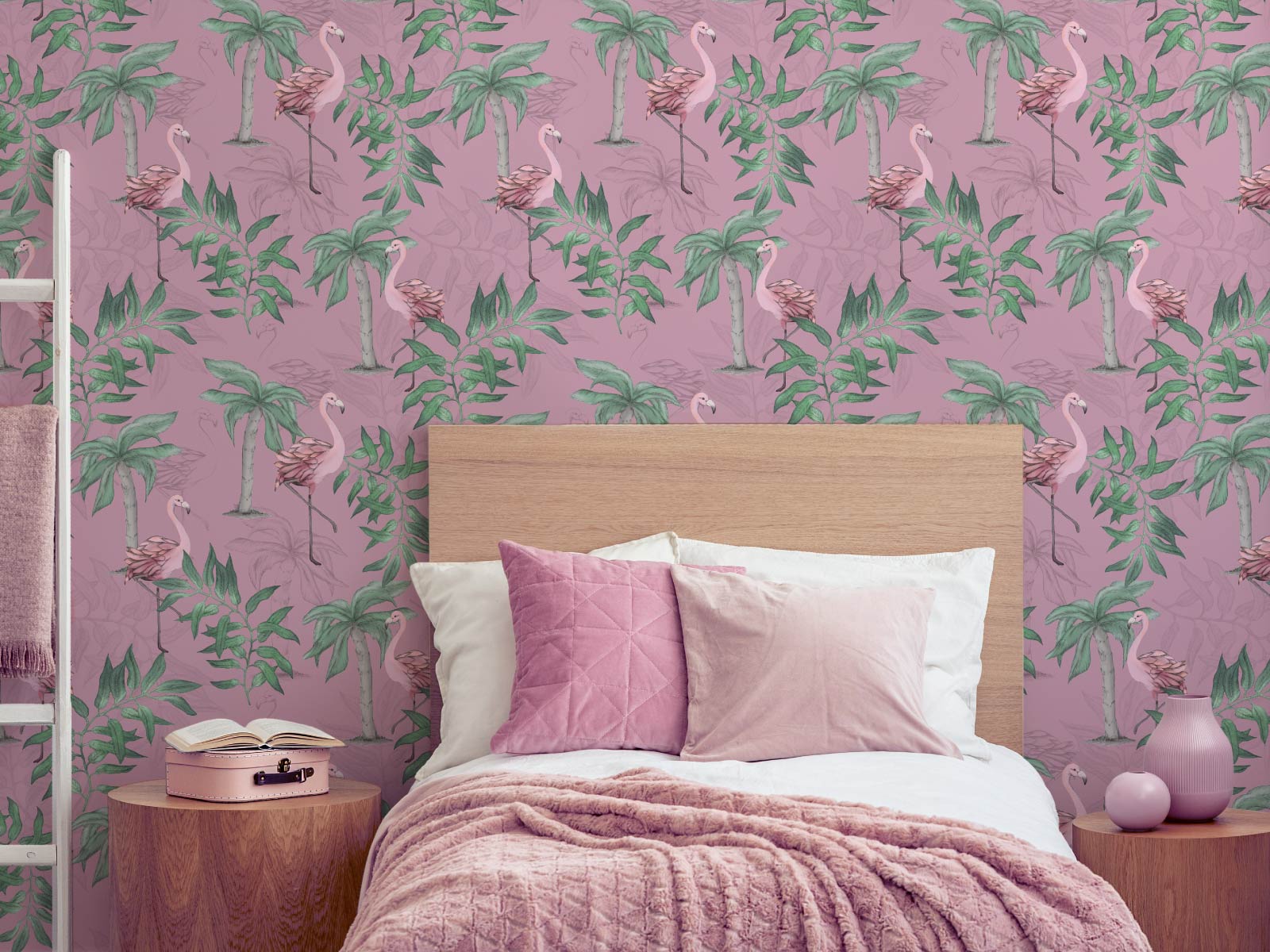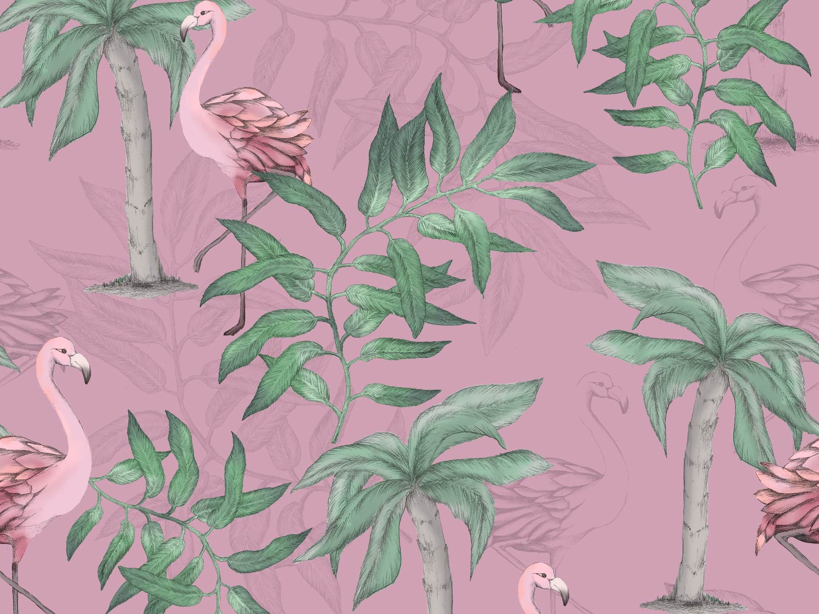 Capture the feeling of the tropics with this stunning fancy flamingo wallpaper, featuring palm trees and palm leaves. Create an eye catching feature wall or a sensational full room coverage.