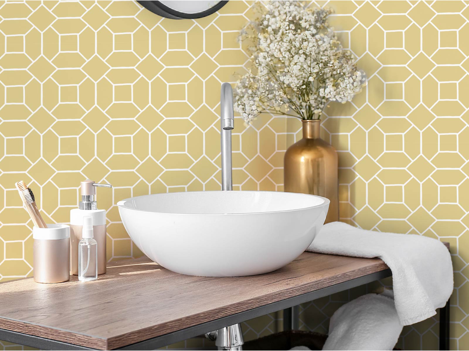 This retro-inspired geometric wallpaper is an excellent choice for updating a whole room in the house or creating a stunning feature wall.