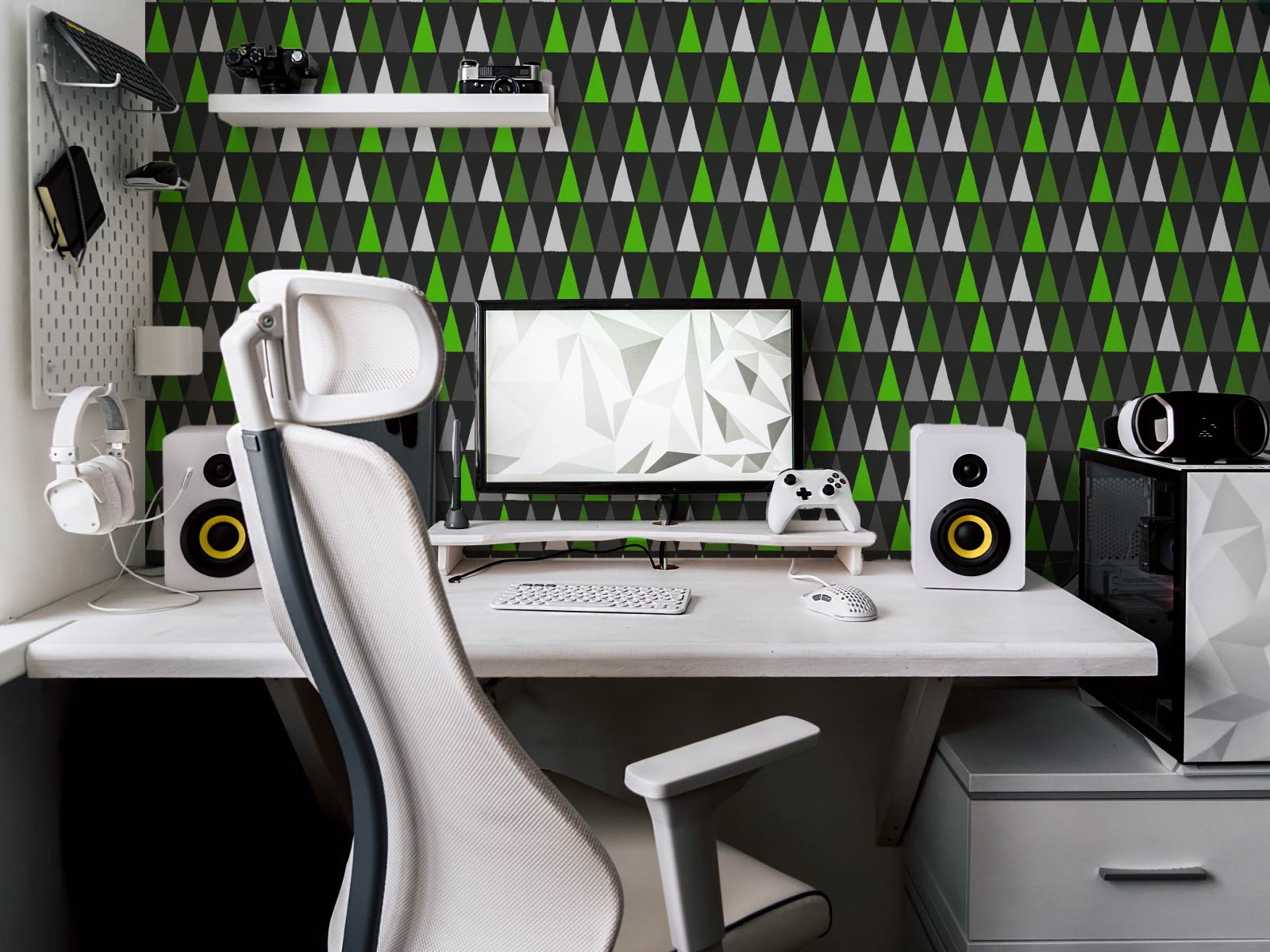 This geometric triangle design will add some fun to your teenager's room. With its nod to gaming through bold bright colours, it makes a fantastic back drop for live steams.