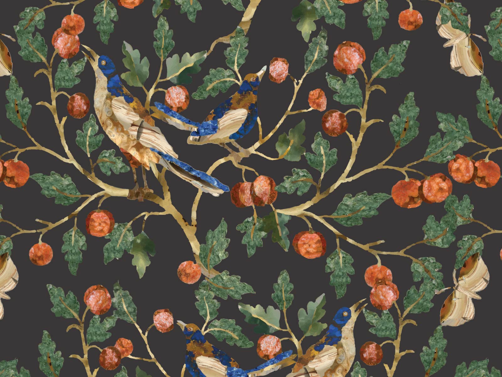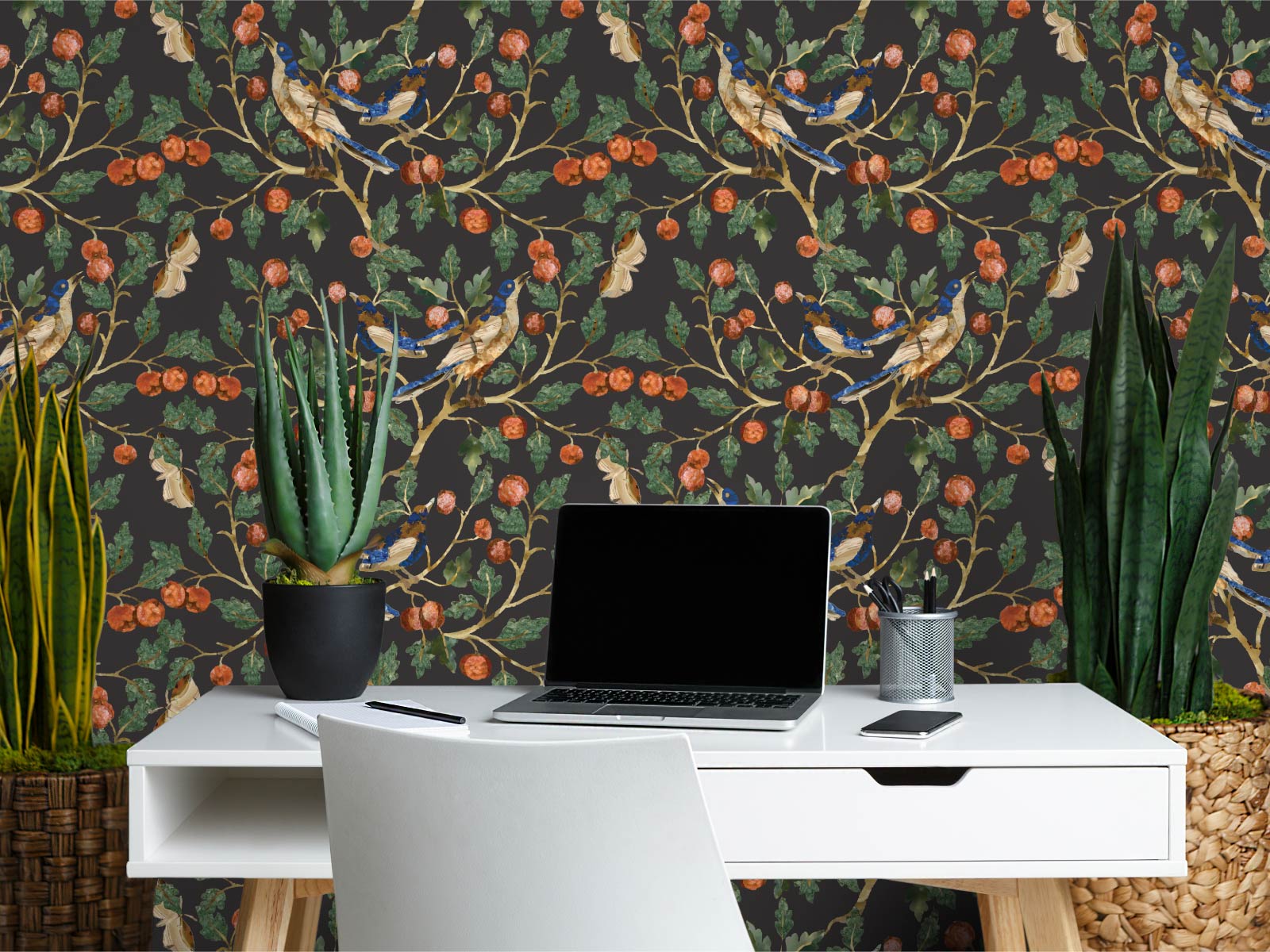 This delicate and charming wallpaper features, beautiful cherry trees and birds against a variety of coloured backgrounds. Add elegance to your bedroom, living room or dining room.