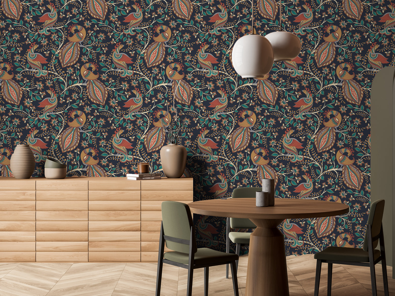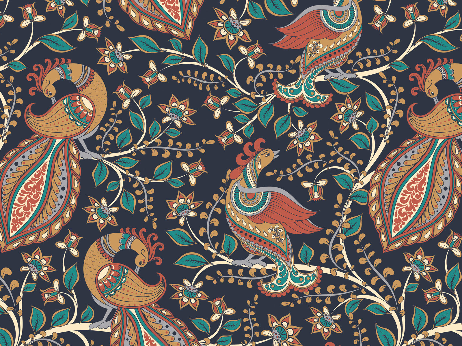 An Indian-inspired wallpaper with ornate birds, flowers, and branches features a detailed and intricate design that combines elements of nature with traditional Indian motifs. The rich colors and intricate details would be perfect for adding a sense of luxury and splendor to any space.
