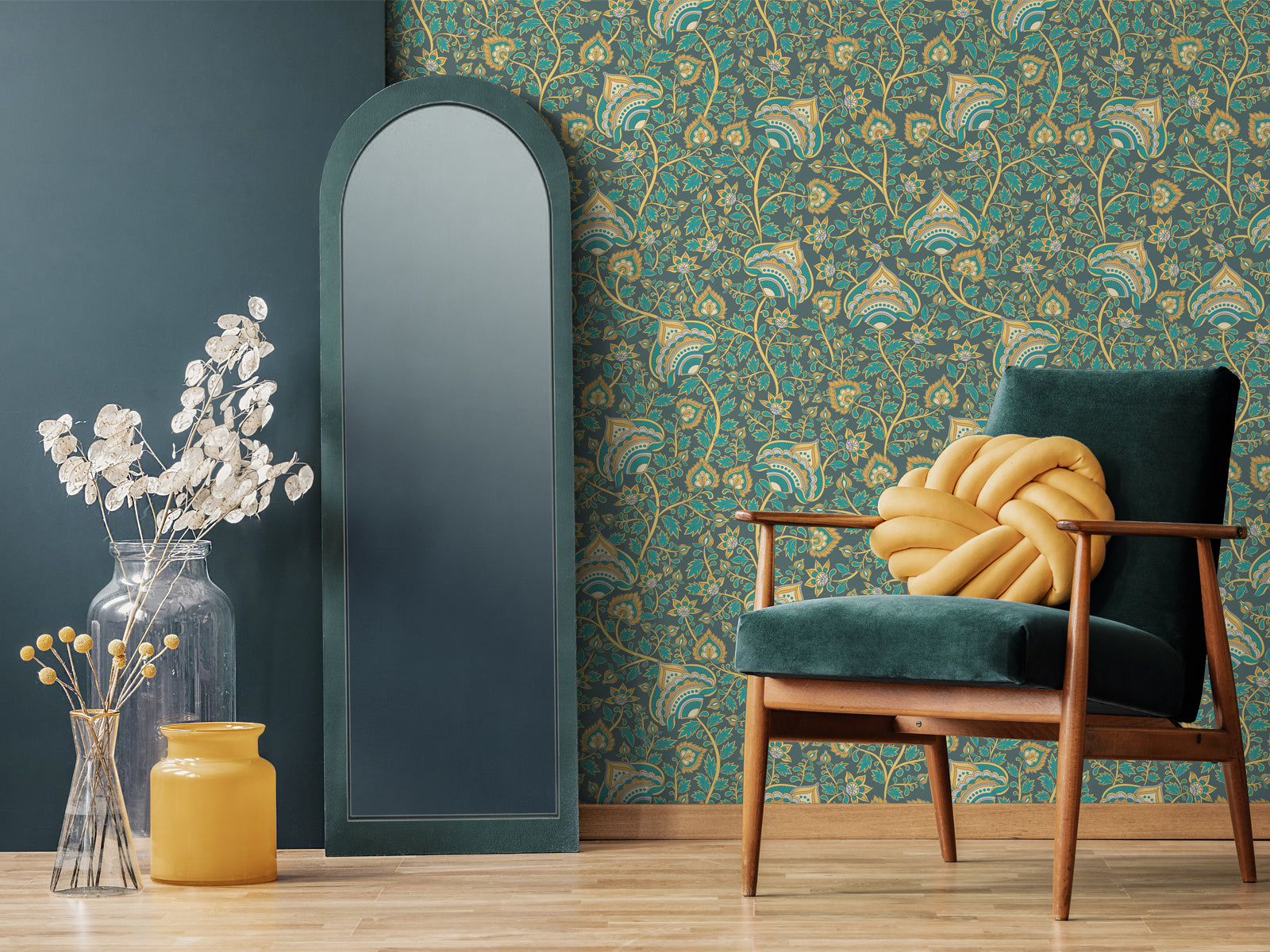 There is a detailed and intricate design of ornate flowers and branches on this Indian-inspired wallpaper, combining elements of nature with traditional Indian motifs. This beautiful piece would enhance any space with its rich colours and intricate details.