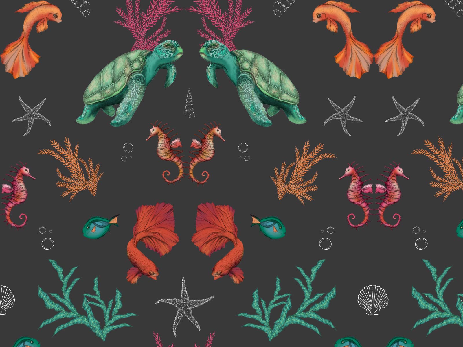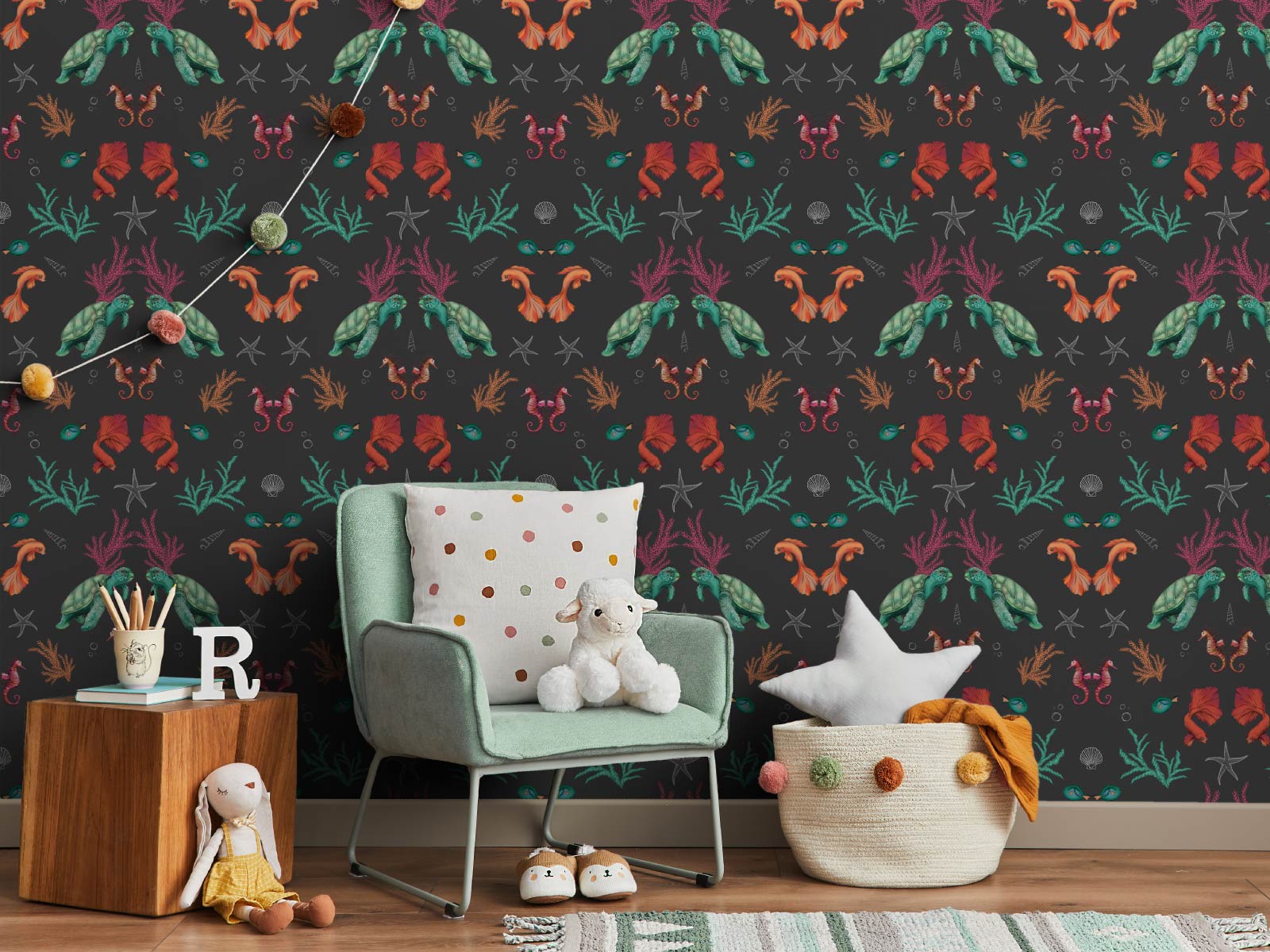 Get your snorkel ready! Discover the wonderful world beneath the waves by diving into the deep blue sea. Featuring turtles, star fish, sea horses, and fish...perfect for your child's bedroom or playroom.