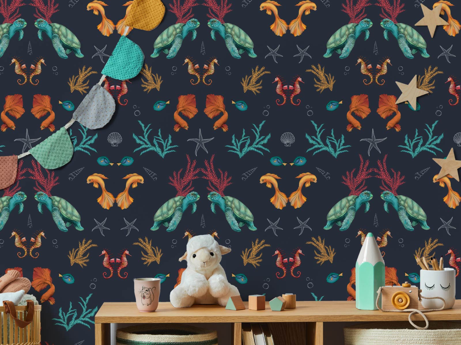 Get your snorkel ready! Discover the wonderful world beneath the waves by diving into the deep blue sea. Featuring turtles, star fish, sea horses, and fish...perfect for your child's bedroom or playroom.