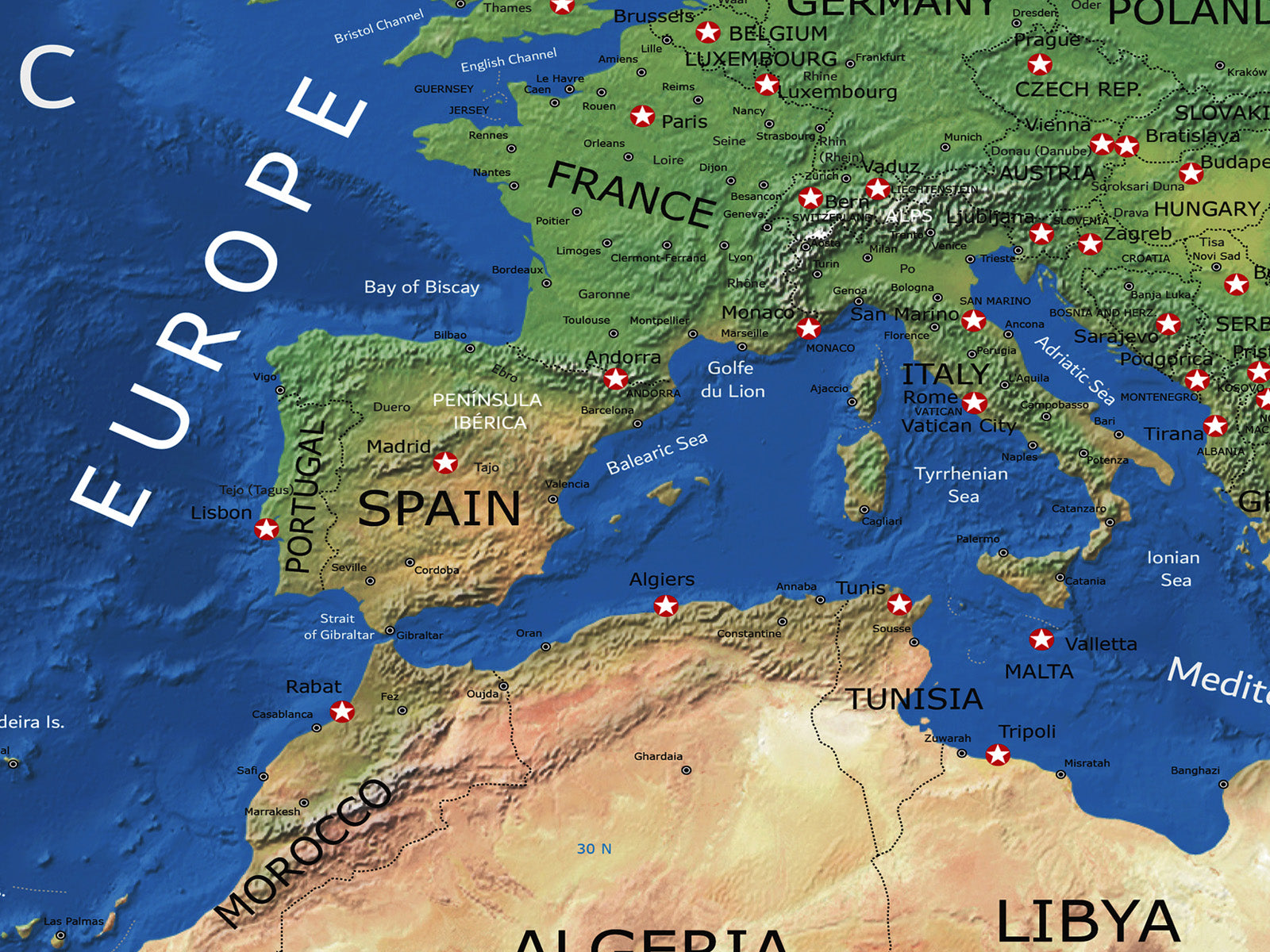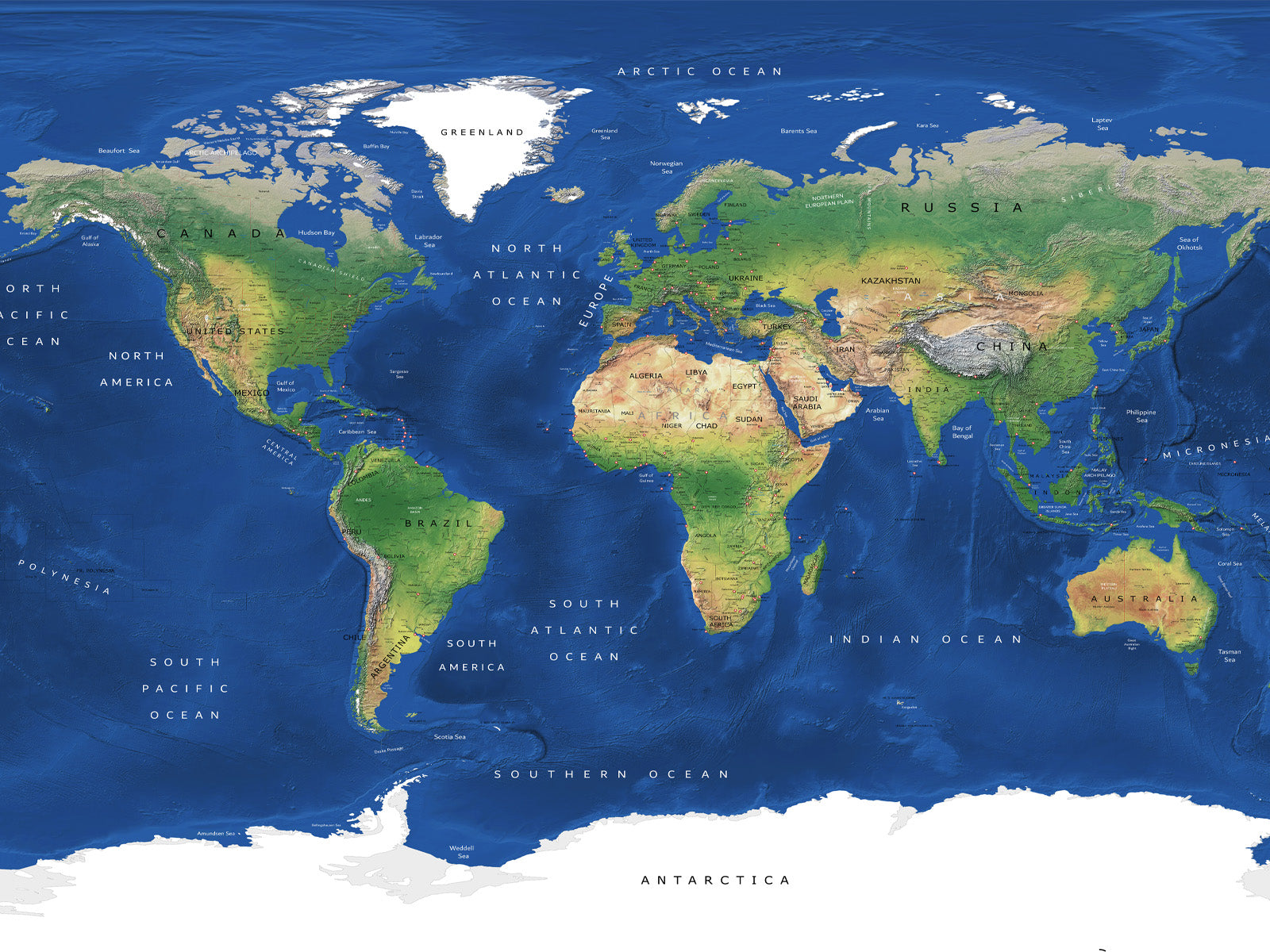 Travel the world with this detailed physical map, showing topographic features of the earths surface. Elevated mountains and hills to plains and valleys, and major towns and cities of the world. Ideal as a feature wall in any room of the home or office