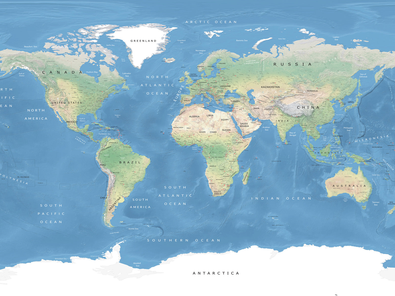 Travel the world with this detailed physical map, showing topographic features of the earths surface. Elevated mountains and hills to plains and valleys, and major towns and cities of the world. Ideal as a feature wall in any room of the home or office.