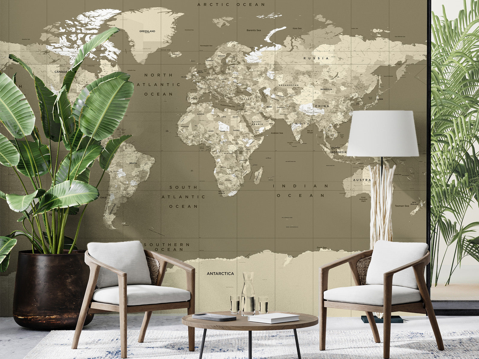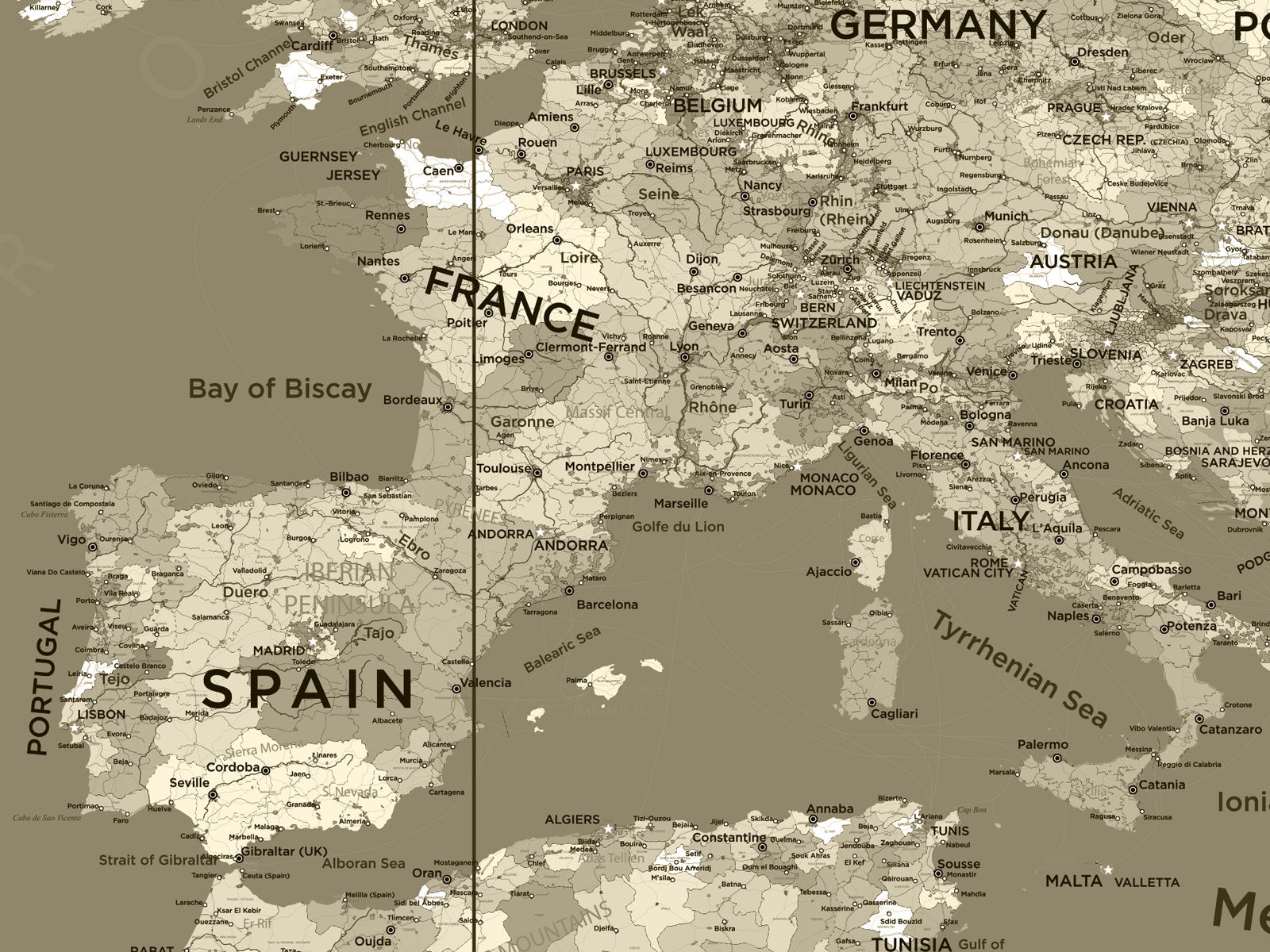Travel around the world with this detailed political map, showing continents, countries, territories, cities, towns, major roads and sea routes of the world. Ideal as a feature wall in any room of the home or office.