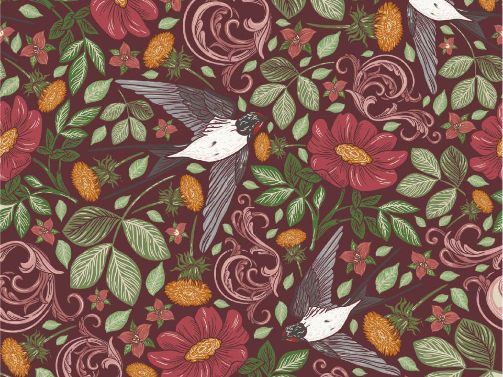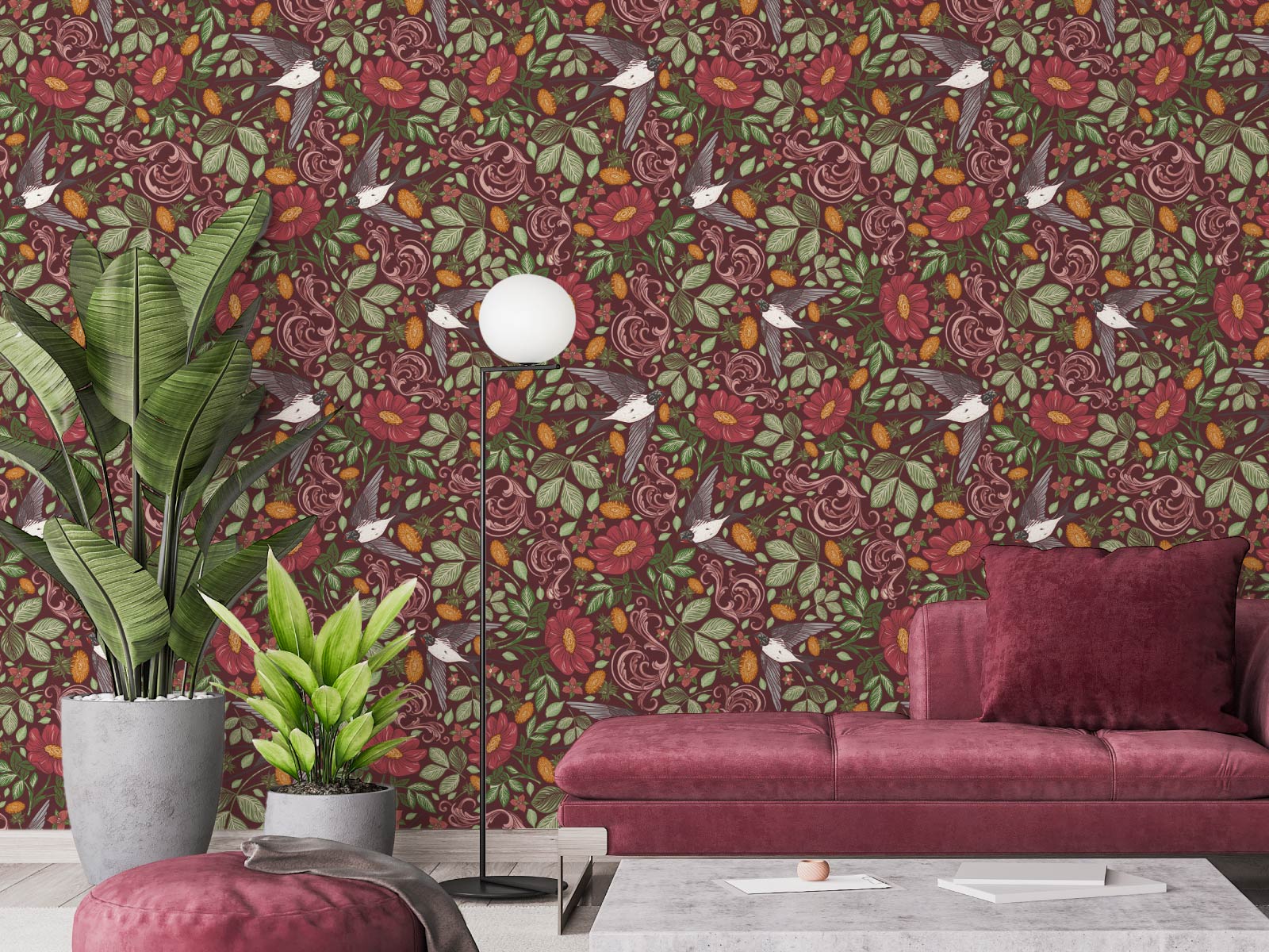Glide through the air with this majestic Swallow design. Featuring charming flowers and delicate leaves, this intricate wallpaper is ideal for creating a stunning feature wall.