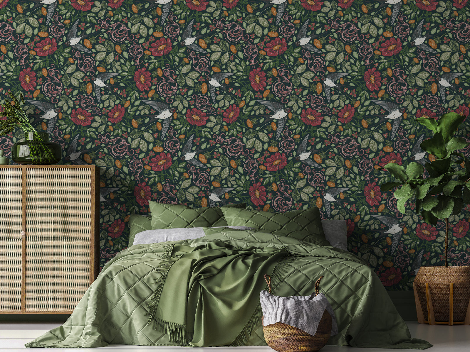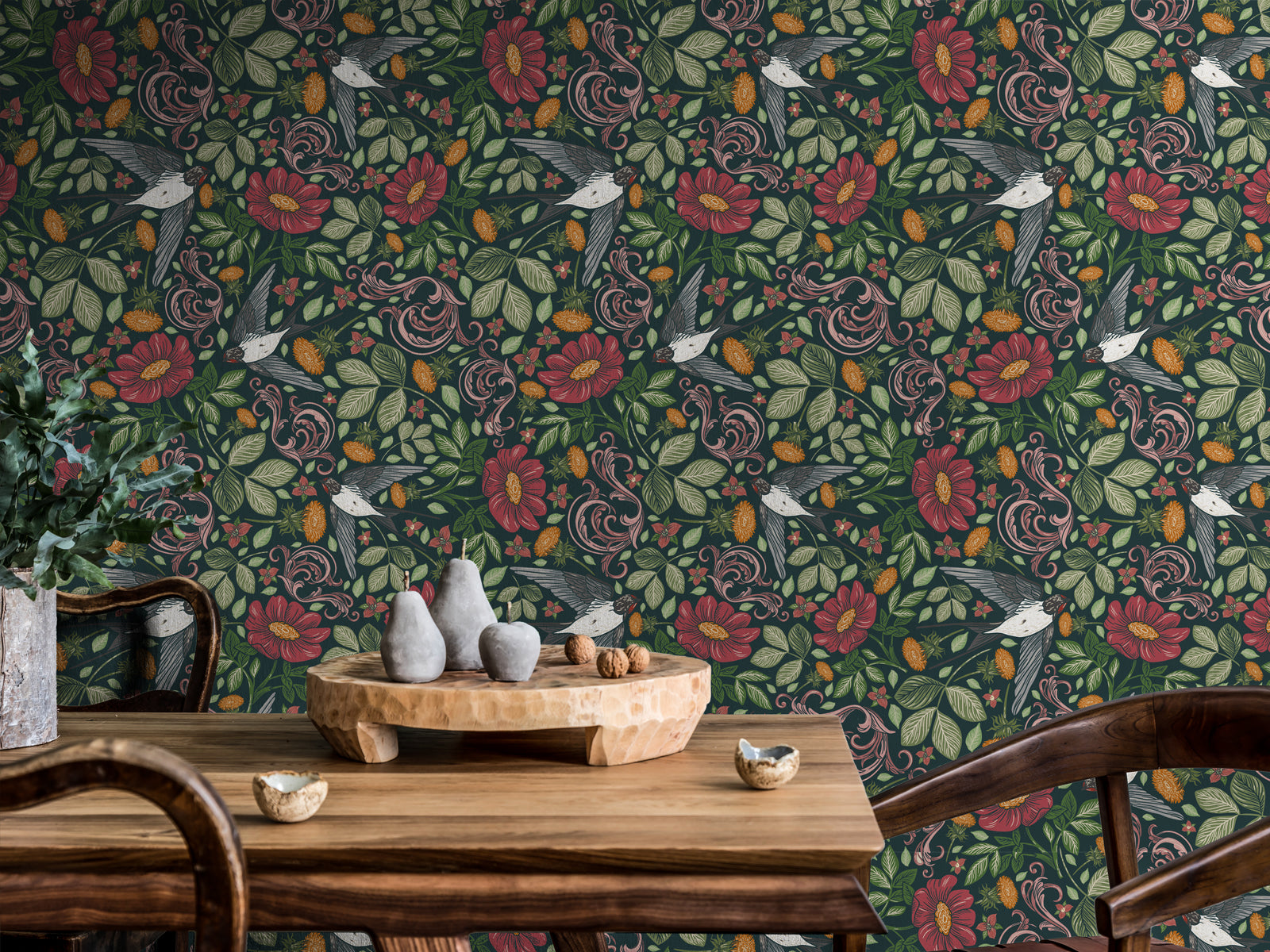 Glide through the air with this majestic Swallow design. Featuring charming flowers and delicate leaves, this intricate wallpaper is ideal for creating a stunning feature wall.