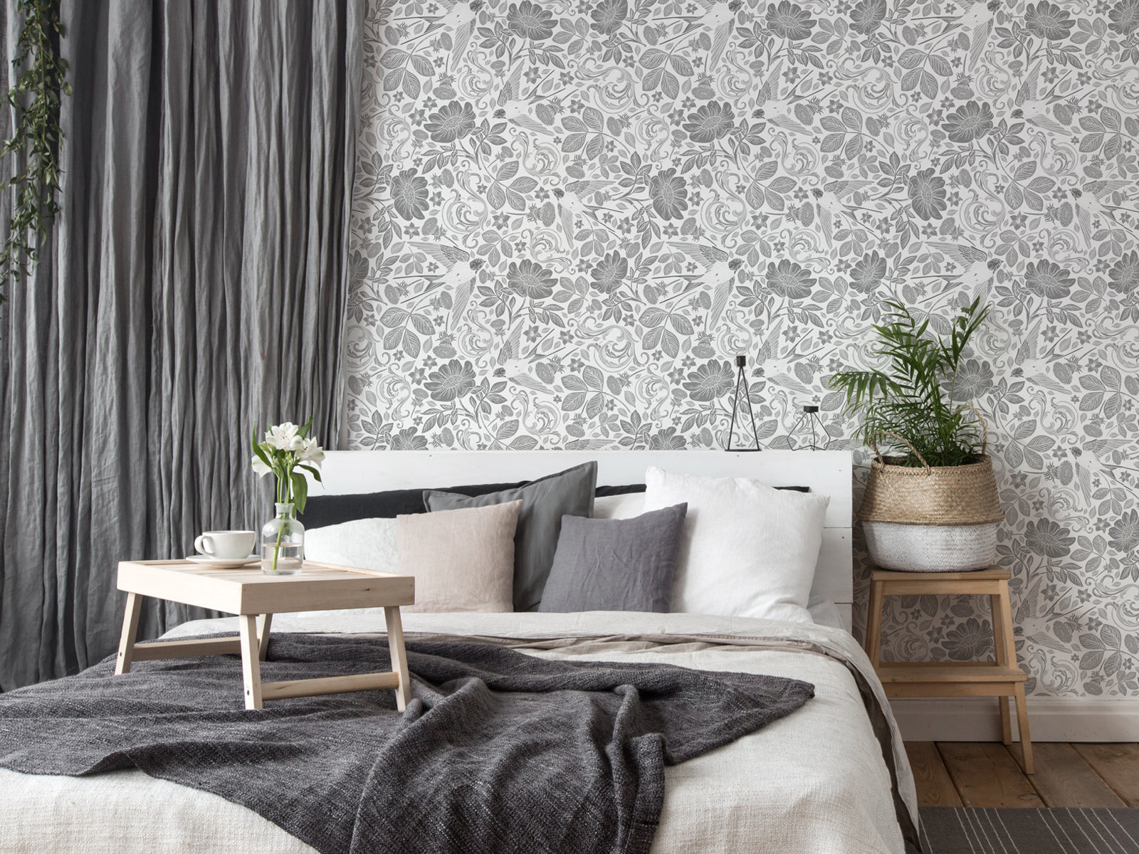Glide through the air with this majestic Swallow design. Featuring charming flowers and delicate leaves, this intricate wallpaper is ideal for creating a stunning feature wall.